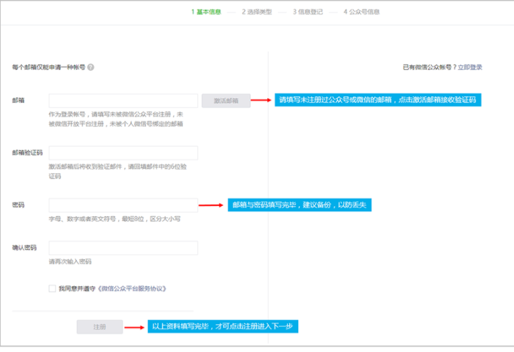 公眾號分訂閱號、服務(wù)號、小程序三種帳號類型,注意注意1個郵箱只能注冊1個帳號。