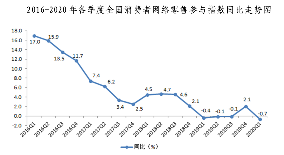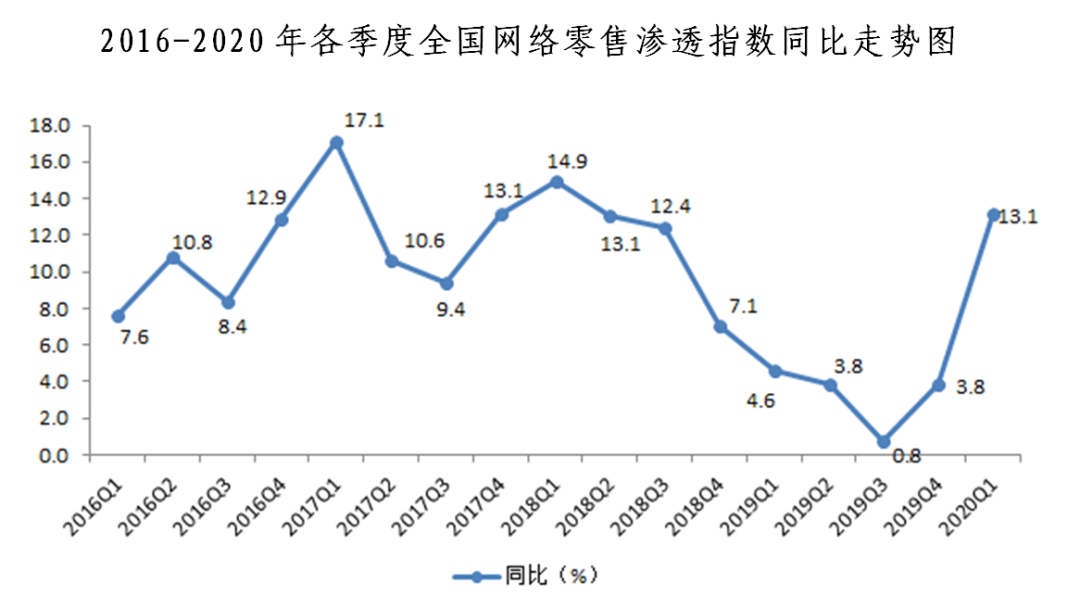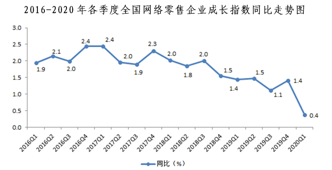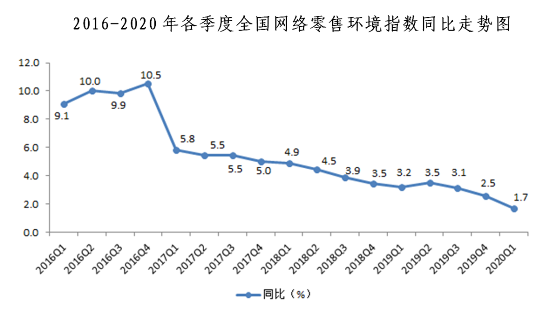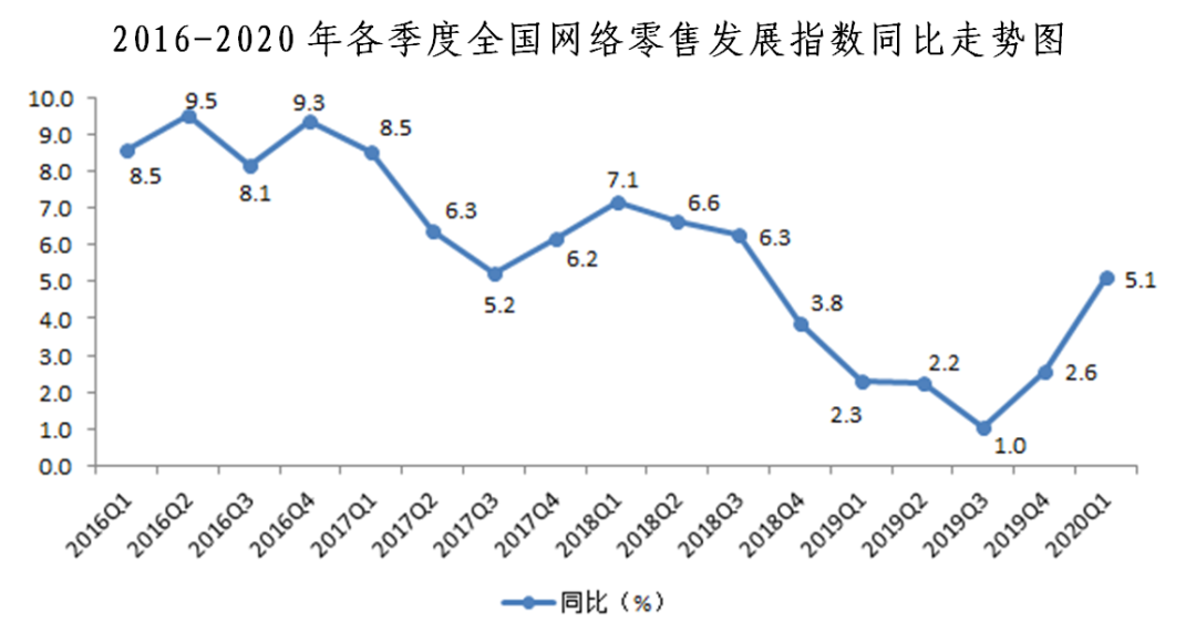 2020年一季度全國(guó)網(wǎng)絡(luò)零售發(fā)展指數(shù)同比增長(zhǎng)5.1%