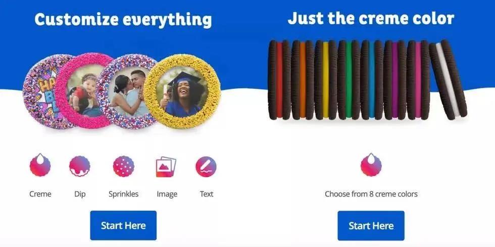 前段時間,奧利奧首次推出定制餅干服務(wù)。奧利奧提供了兩種定制方式,一種是你的餅干你做主,消費者可以自己選擇奶油顏色,紅橙黃綠紫白,盡可挑選。